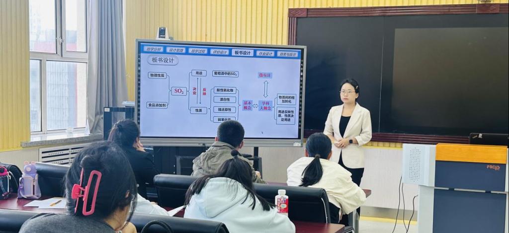 示范课结束后,说课展示环节随即展开。伊萍老师以“探究葡萄酒中的二氧化硫”为例,进行规范精彩的说课。她从教材分析切入,精准把握教材地位;结合学生知识储备与认知特点做学情分析;围绕新课标核心素养定教学目标、明重难点;还详细阐述教学过程,各环节环环相扣,同步说明设计意图与理论依据。其说课展现对教学内容的理解与科学设计思路,获在场师生好评。