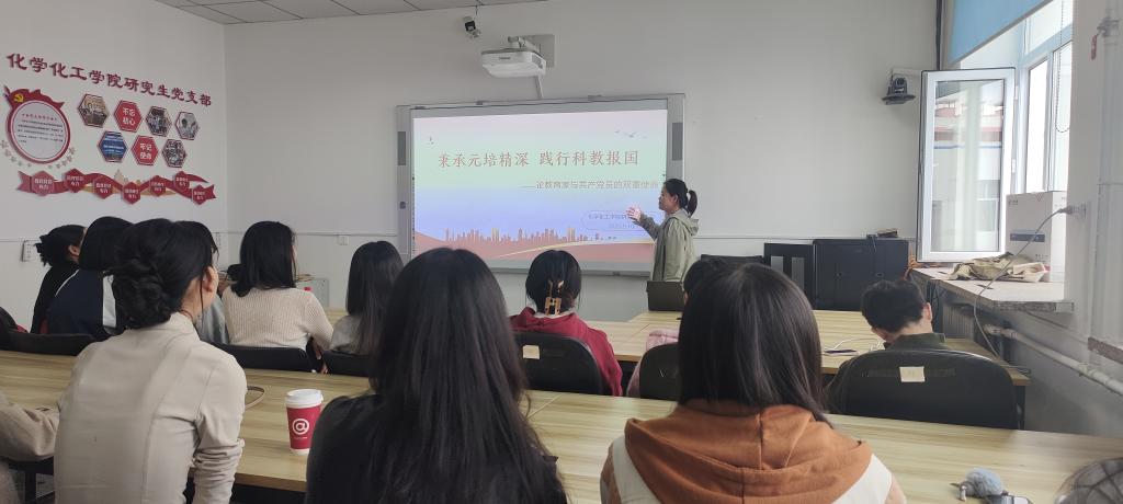 为深入学习与传承教育家精神,强化党员责任担当,化学化工学院研究生党支部于9月24日12时在理工楼603组织全体党员召开“传承教育家精神,勇担时代新使命”主题宣讲会。会上,三位学生党员分别以蔡元培、张桂梅、陶行知三位教育家为核心,围绕其教育理念、奉献精神与时代价值展开宣讲,支部全体党员及部分入党积极分子参会,共同在思想碰撞中汲取奋进力量。